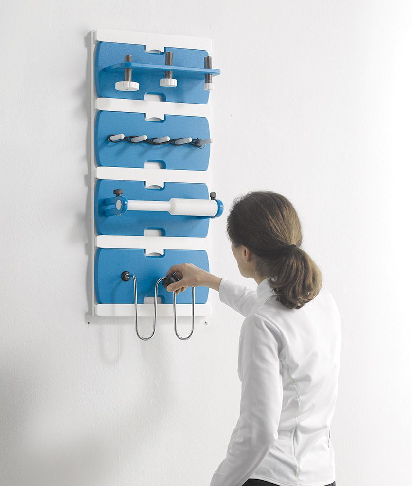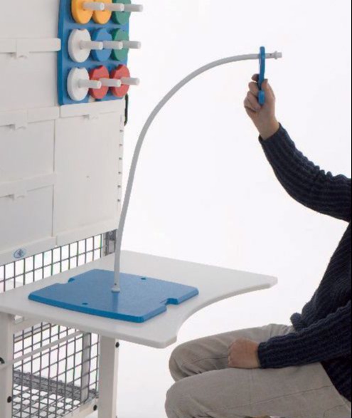 Une fois que l'aide à travailler a été identifiée, elle peut être positionnée à la bonne hauteur.  La possibilité de positionner l'aide individuelle au travail plus haut apporte gradualité et progression à l'exercice, au fur et à mesure que le patient s'améliore.  De plus, la même aide au travail peut être utilisée en position horizontale ou inclinée entre 0 ° et 90 °.