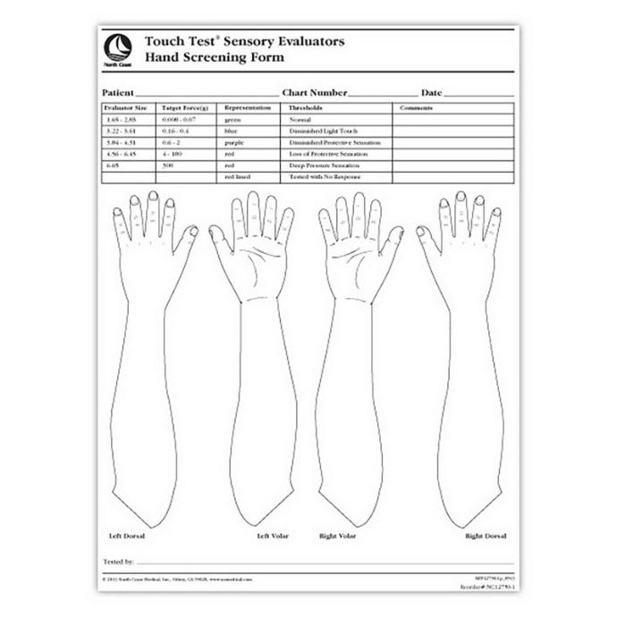 Touch-Test - Formulaire d'évaluation pour la sensibilité de la main. Emballage de 100 pages