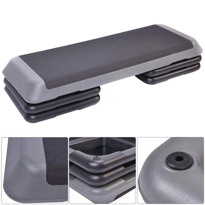 Marche pour aérobie ajustable à trois (3) hauteurs: 10 cm (4") - 15 cm (6") - 20 cm (8"). La plate-forme mesure 108 cm (43") de long, 40 cm (16") de large et 10 cm (4") de haut. Les blocs mesurent 40 cm (16") carrés et 5 cm (2") de haut