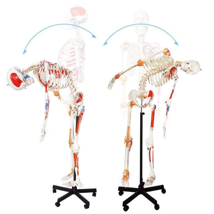 Ce squelette anatomique est doté d'articulations articulées permettant la mobilité. Il est doté de bras et de jambes amovibles, d'une mâchoire mobile et d'un couvre-tête. Ce modèle anatomique complet est monté sur un support. Le support à 5 roulettes vous permet de le déplacer où vous le souhaitez.